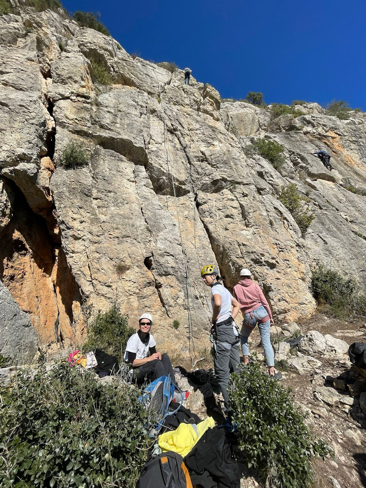 Pour ce séjour, l’équipe triée sur le volet se compose de Céline, organisatrice hors pair qui surveille d’un œil attentif que personne ne manque de rien. Matthieu, 2nd organisateur en chef et pilote de rallye des Corbières à ses heures perdues. Sigrine, qui attire les jeunes à coup de « mon Lapin » pour partager sa gamelle favorite à la pause dej: le taboulé gravillon. Hubert, pour qui sa passion pour l’escalade se retrouve jusque dans sa cuisine : des congolais en forme de montagne. Jacqueline, pour qui le télétravail entre deux voies n’a plus de secret. Justine, la fan insatiable des débats de manips de fin de voies. Madeline, qui ne lâche pas son sourire et persévère dans la grimpe malgré ses mains dont les extrémités ressemblent désormais davantage à des steaks qu’à des doigts. Paul alias Bernie, qui a englouti à lui seul la moitié des plats préparés. Alexandre alias Cauchy, le diesel de l’équipe qui a fini par voler sur des 6b et Paul alias Pote Paul, qui vous rédige ce billet.