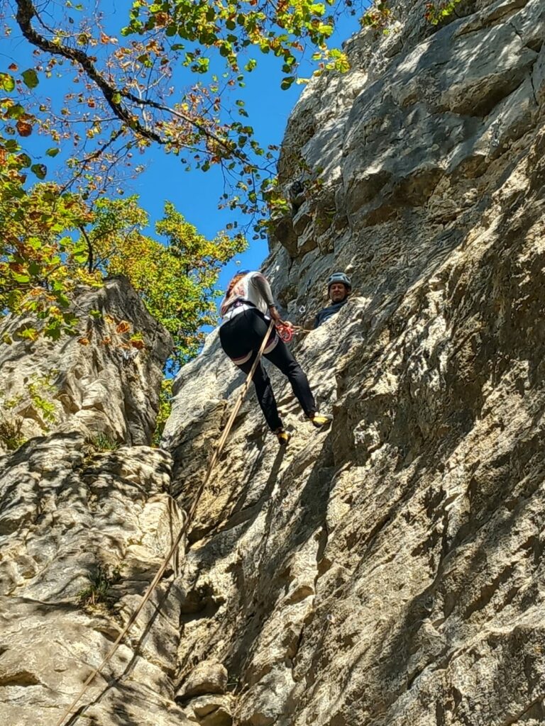 Le samedi on commence l’initiation extérieure pour les débutant.e.s. On a de la chance, il fait super beau ! On a même le temps de voir le rappel et d’envoyer Éric faire une 5b+ en tête avec un bon surplomb sous couvert de « j’ai pas réussi à la grimper en tête mais si tu la passes j’irai en moule ». Qu’est ce qu’on ne ferait pas pour voir nos formateurs transpirer.